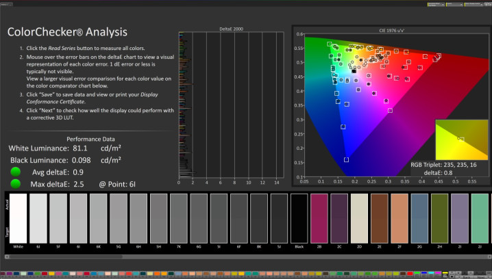 最后在色彩精准度(色准)上,HKC GS27QES的表现同样令人惊喜。其平均ΔE仅为0.9,最大ΔE也控制在了2.5。对于一台电竞显示器来说,能达到如此精准的色彩还原实属难得。综合来看,HKC GS27QES凭借其优异的色域、色准与对比度表现,不仅能胜任游戏娱乐,即使用于一些轻度的专业性工作也已足够。