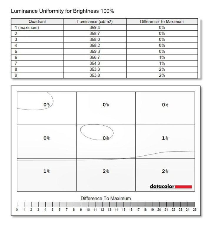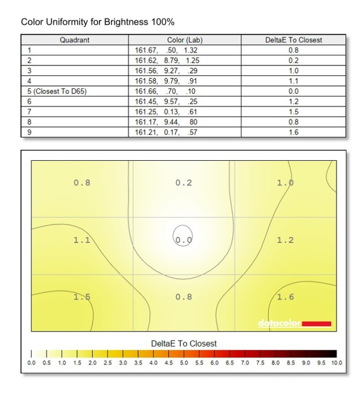 屏幕均匀性是OLED的另一大传统强项,而HKC GS27QES的表现再次印证了这一点。在100%亮度下,其色彩均匀性表现出色,偏差最大的区域ΔE也仅为1.6;而亮度均匀性的最大偏差更是控制在了2%。如此微小的差异,肉眼已极难察觉,证明了屏幕显示的高度一致性。
