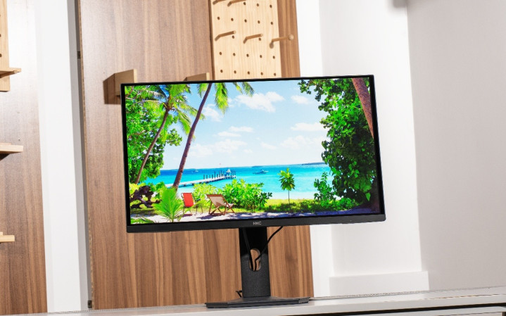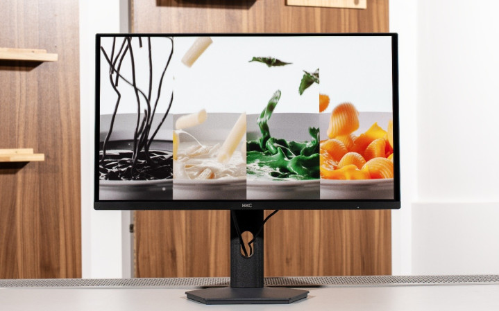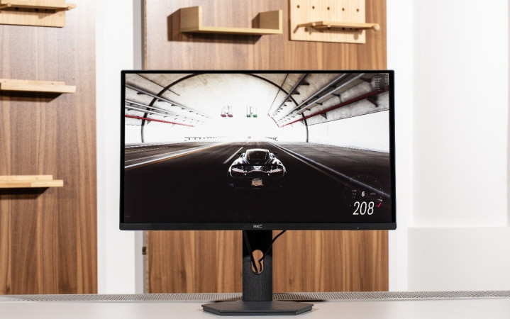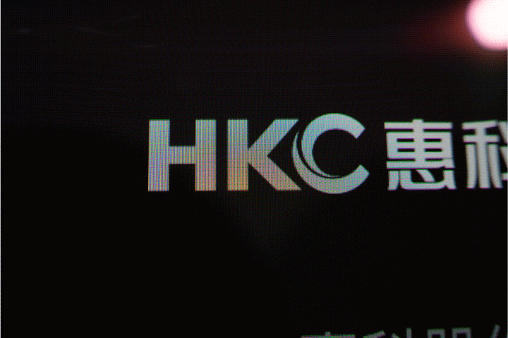 看完支架之后,让我们将视线转向显示器本体。HKC GS27QES的正面采用了时下主流的三面超窄边框设计,点亮后,极高的屏占比带来了出色的视觉沉浸感。同时为了增强沉浸感,HKC GS27QES的正面设计极为简约,仅在屏幕下边框中央印有“HKC”的品牌Logo。