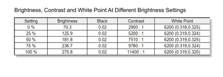 接下来看面板的基础素质。HKC GS27QES的SDR最高亮度达到了275.8 nits,对于OLED显示器而言已属上等水平,足以应对室内灯光环境。更重要的是,它充分展示了OLED在对比度上的绝对优势,即使是在最低亮度时,对比度也远超LCD面板显示器。同样出色的还有其稳定性,HKC GS27QES的白点在不同亮度下的表现高度一致,始终维持在6200K,确保了各种条件下画面观感的一致性。