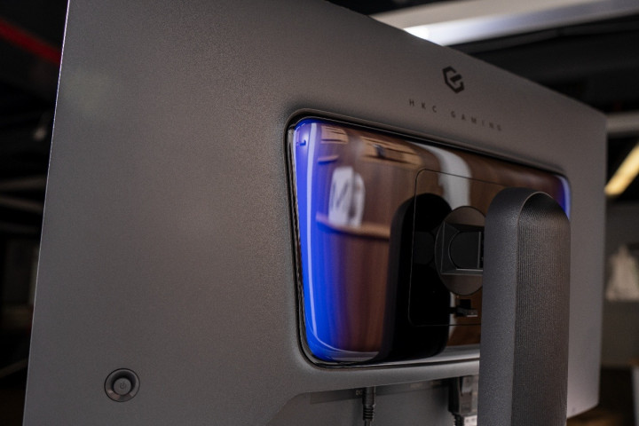 与内敛的正面不同,HKC GS27QES的背面设计则展现出更具电竞感的炫酷风格。背部梯形镜面区域搭载的翼型RGB氛围灯带相当引人注目,为桌面增添了恰到好处的氛围。
