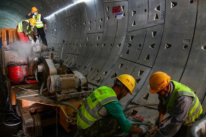 2024年4月27日,济南地铁4号线泉城公园站至千佛山站区间双线隧道顺利贯通。这是中铁十四局建设者在隧道内施工。新华社记者 朱峥 摄