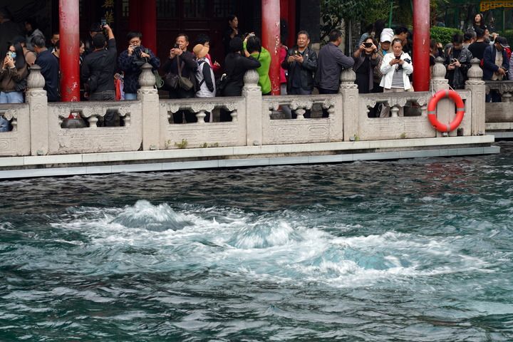 2025年10月15日,位于山东省济南市的趵突泉实时水位达到30.32米,创下1966年以来的最高水平。新华社记者 朱峥 摄
