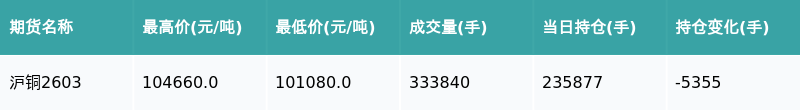 21智讯1月15日电,南财金融终端盘后期货数据显示,上海期货交易所的沪铜主力合约收跌1.31%,收盘报102810.0元/吨,日内资金流出7.8亿元。其他相关指标见下表: