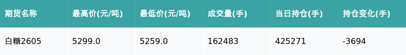 21智讯1月15日电,南财金融终端盘后期货数据显示,郑州商品交易所的白糖主力合约收跌0.09%,收盘报5280.0元/吨,日内资金流出3318.56万元。其他相关指标见下表: